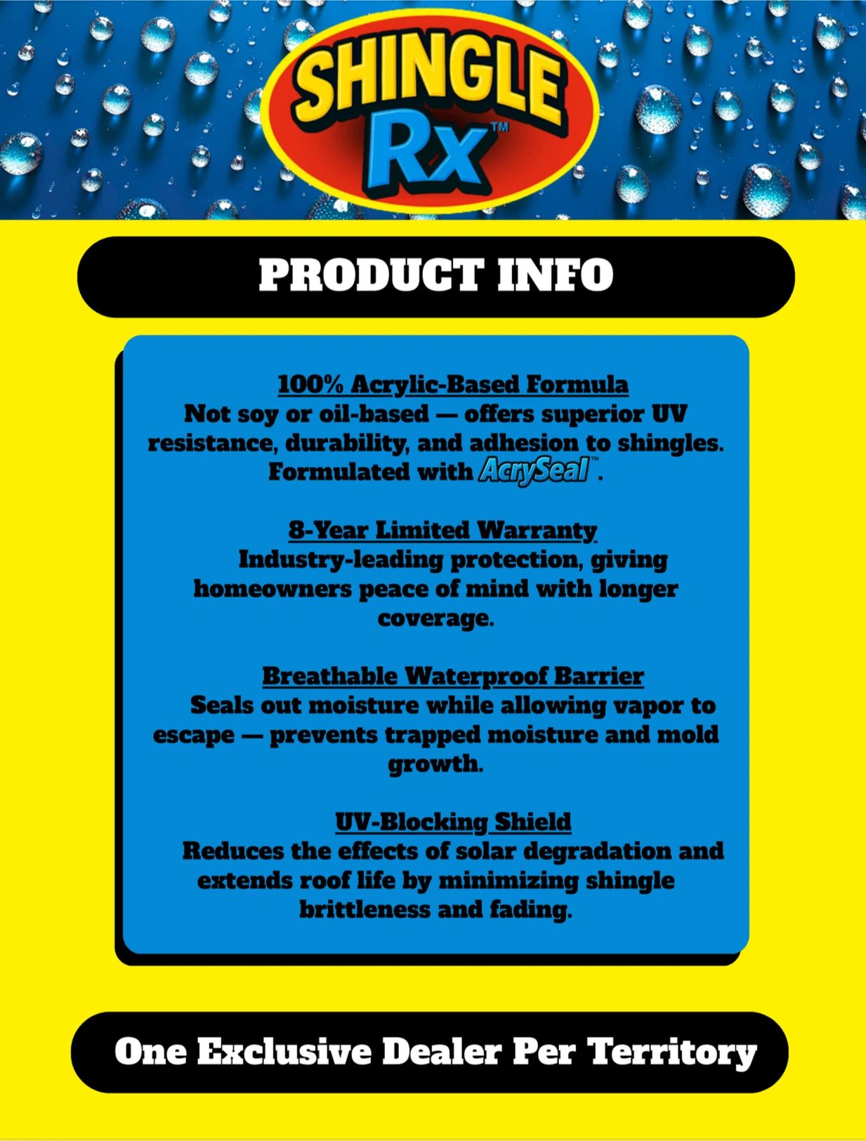 Shingle RX is an eco & budget friendly acrylic based 8 year warranted roof coating designed to help homeowners have piece of mind against water intrusion, granular loss, and algae streaking, the 8 year warranty is also transferrable, meaning that once your 8 year warranty is up we can come out again to seal it a second time at the original price.